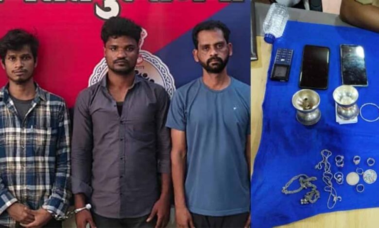 गिरफ्तार आरोपितों में शशी कुमार (23), शेट्टी विजय (45) और शेट्टी सूर्या (31) शामिल हैं। सभी हैदराबाद के अलग-अलग क्षेत्रों के निवासी हैं। पुलिस ने उनके कब्जे से चांदी के दिए, कटोरे, बिछिया, कान के टाप्स, कड़ा, बाजूबंद, सोने के टाप्स और लॉकेट समेत अन्य जेवरात बरामद किए हैं। बरामद सामान की कुल कीमत करीब पांच लाख रुपये आंकी गई है। इसके अलावा वारदात में इस्तेमाल किया गया चाकू भी जब्त किया गया है। पुलिस अन्य फरार आरोपितों की तलाश में जुटी है।